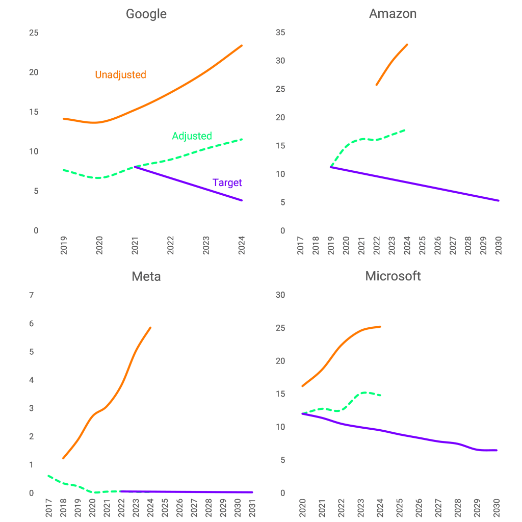 What we see is companies veering wildly away from their climate targets. In most cases, this is true whether you use their ‘adjusted’ metrics that incorporate renewable energy offsets and deals or not.